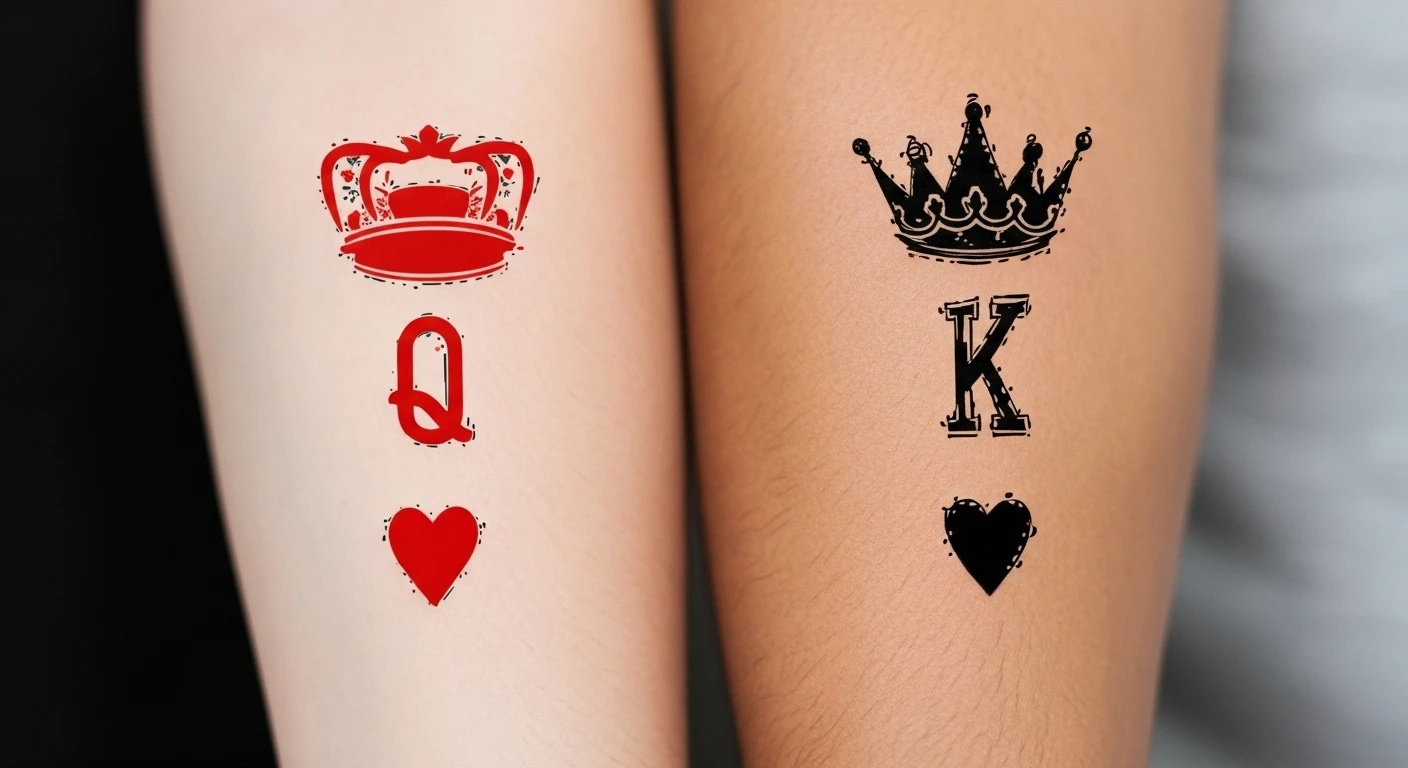 The King and Queen tattoo idea represents a powerful symbol of love, commitment, and unity between partners, often depicted through regal crowns, intertwined initials, or even portraits of the couple styled as royal figures, This concept is an enduring favorite among couples and symbolizes not just a romantic relationship but also a partnership that embodies respect, authority, and loyalty, The King and Queen tattoos serve as a beautiful reminder of the bond shared, making them popular tattoo ideas for those wanting to celebrate their relationship in a meaningful way, Historically, the imagery of kings and queens has deep roots in monarchy and feudal societies, where the figures represented leadership and protection, In various cultures, these figures have been revered not just for their status but for their governance and familial ties, signaling the importance of kinship and alliance, The tattoo idea has evolved over time, absorbing influences from different cultures and artistic expressions, transitioning from traditional representations to modern interpretations in the tattoo world, The meaning behind King and Queen tattoos goes beyond mere aesthetics; it symbolizes a partnership built on mutual respect and admiration, Culturally, they can represent an indestructible bond, conveying messages of fidelity and devotion, For many, these tattoos embody personal stories of growth, teamwork, and the acknowledgment of each partner's strengths, setting the groundwork for a lifelong commitment, The symbolism can also draw on themes of empowerment, with wearers embracing their identities and statuses within the relationship as both rulers and equals, When it comes to styles, the King and Queen tattoo idea lends itself well to a variety of artistic expressions, Neo-traditional and blackwork styles are particularly popular, as they allow for intricate details while maintaining bold outlines and contrast, Realism is another favored choice for those wanting a lifelike portrayal of their royal symbols, while watercolor style can add delicate touches of color, imbuing the design with a more ethereal quality.