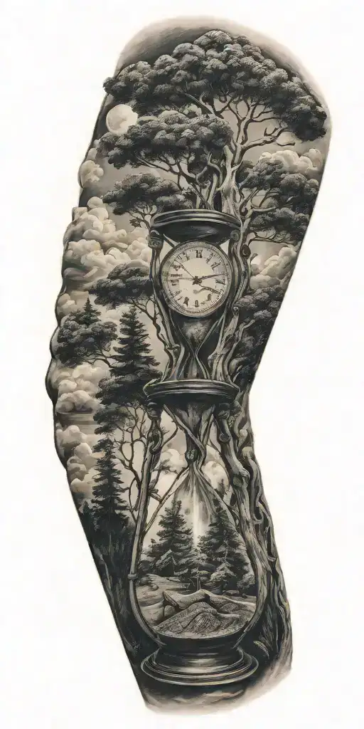 Geometric designs may appeal to those who prefer clean lines and abstract representations, Each of these styles can bring something unique to the Tree Hourglass tattoos, allowing for personalized expression, For suitable placements of the Tree Hourglass tattoo idea, the forearm, upper arm, or back are ideal locations, The forearm allows for visibility and serves as an excellent canvas for showcasing the intricate details of the tree and hourglass, An upper arm placement can provide a larger area for more elaborate designs, while the back offers a broad space that can accommodate intricate artwork without limitations, Considering these placements ensures the tattoo can be appreciated by both the wearer and others, enhancing its impact as a powerful visual statement, To further customize the Tree Hourglass tattoo ideas, variations such as integrating celestial bodies like the sun and moon, or elements of personal significance like family initials or dates, can provide unique interpretations, Some might choose to depict specific tree species that hold personal meaning or add textured shading effects to emphasize depth and movement, This flexibility allows the Tree Hourglass tattoos to not only tell a universal story about life and time but also to reflect the individual experiences of the wearer creatively, In summary, the Tree Hourglass tattoo idea is rich in symbolism, aesthetic appeal, and personal significance, With its versatility across styles and placements, it stands out among tattoo ideas as a meaningful representation of life's journey and the intricate relationship between time and nature, Whether as a standalone piece or part of a larger collection, the Tree Hourglass tattoo is sure to inspire thoughtful reflections, making it a timeless choice for anyone exploring the world of inked art.